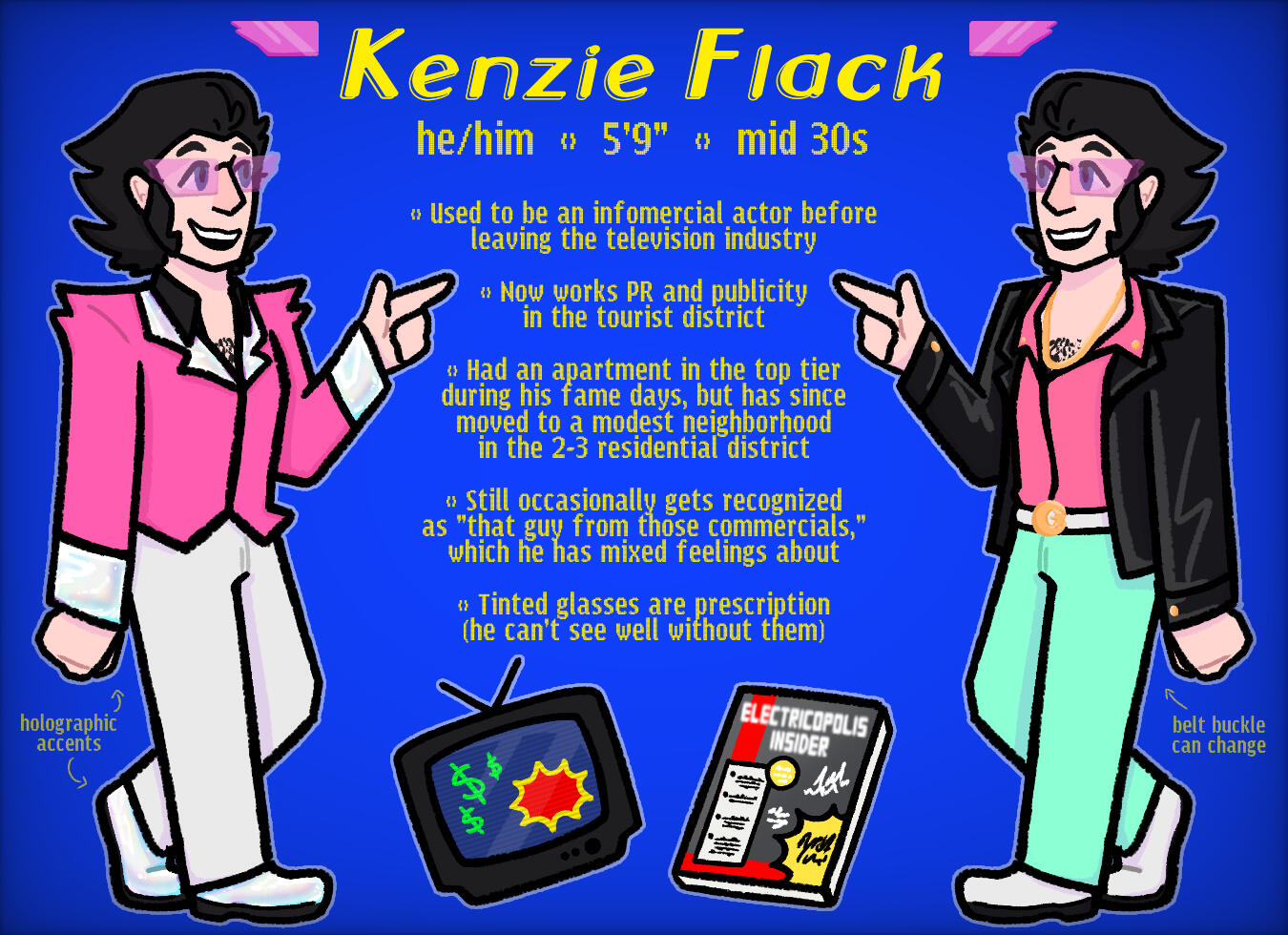 he/himPublicity and PR agent in Electricopolis' tourist district. Ex infomercial actor who left the tv industry.tag - #kenzie📰📺