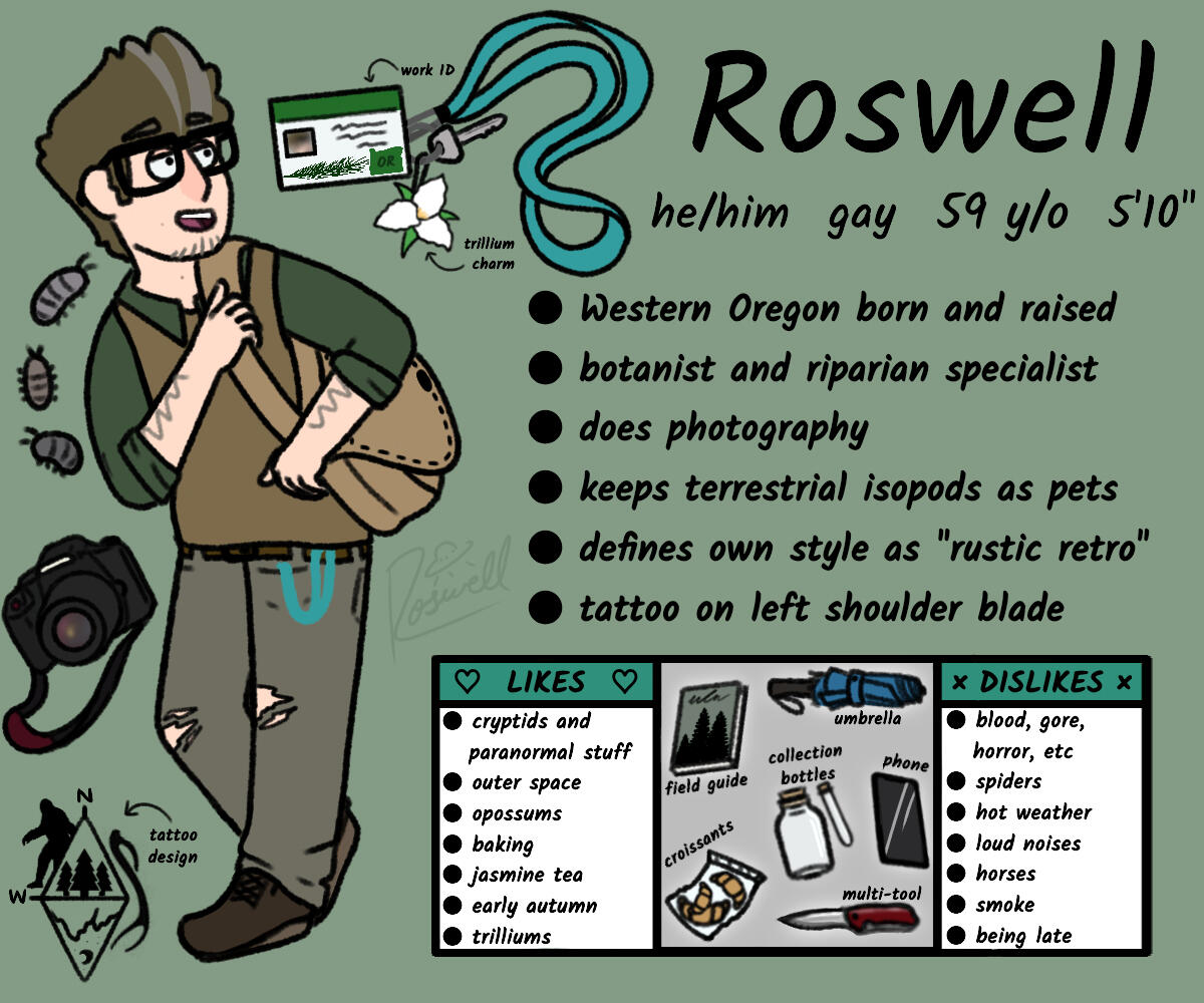 he/himBotanist / geomorphologist / riparian specialist who was assigned to Gravity Falls for work-related research purposes, but grew fond of the area and decided to stay longer than the assignment period. Has an interest in photography and cryptozoology.tag - #roswell🌲🛸