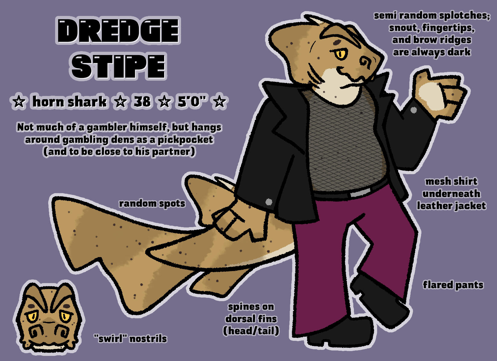 he/him, it/thatSleazy horn shark. Hangs out around gambling dens to weasel his way closer to the big shots and bum winnings off of them (if not just pickpocket directly). Ended up taking a genuine liking to Jack. Enjoys sharing Jack's spoils and being his eye candy. WILL flirt with other sharks around the table to distract them for Jack's benefit.tag - #dredge🦈⭐