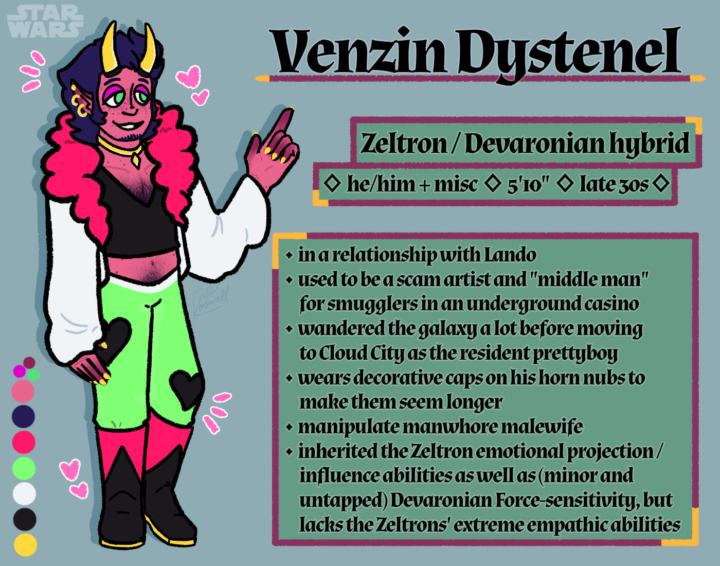 he/him, it/that, misc neopronounsZeltron / Devaronian hybrid. Used to be a middle-man for smugglers in an underground casino, but is now just Cloud City's resident prettyboy and Lando's arm candy.tag - #venzin💎🌠