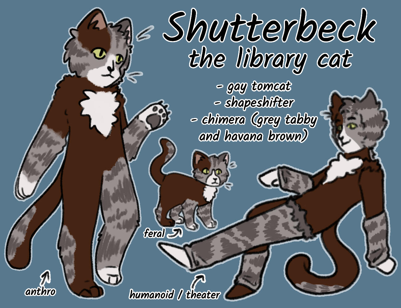 he/him, it/that"The library cat." New member of the Jellicle Tribe. Havana brown / grey tabby chimera. Hangs out in and around the local library when in full cat form, and is welcomed by the patrons and staff.tag - #shutterbeck🐈📖