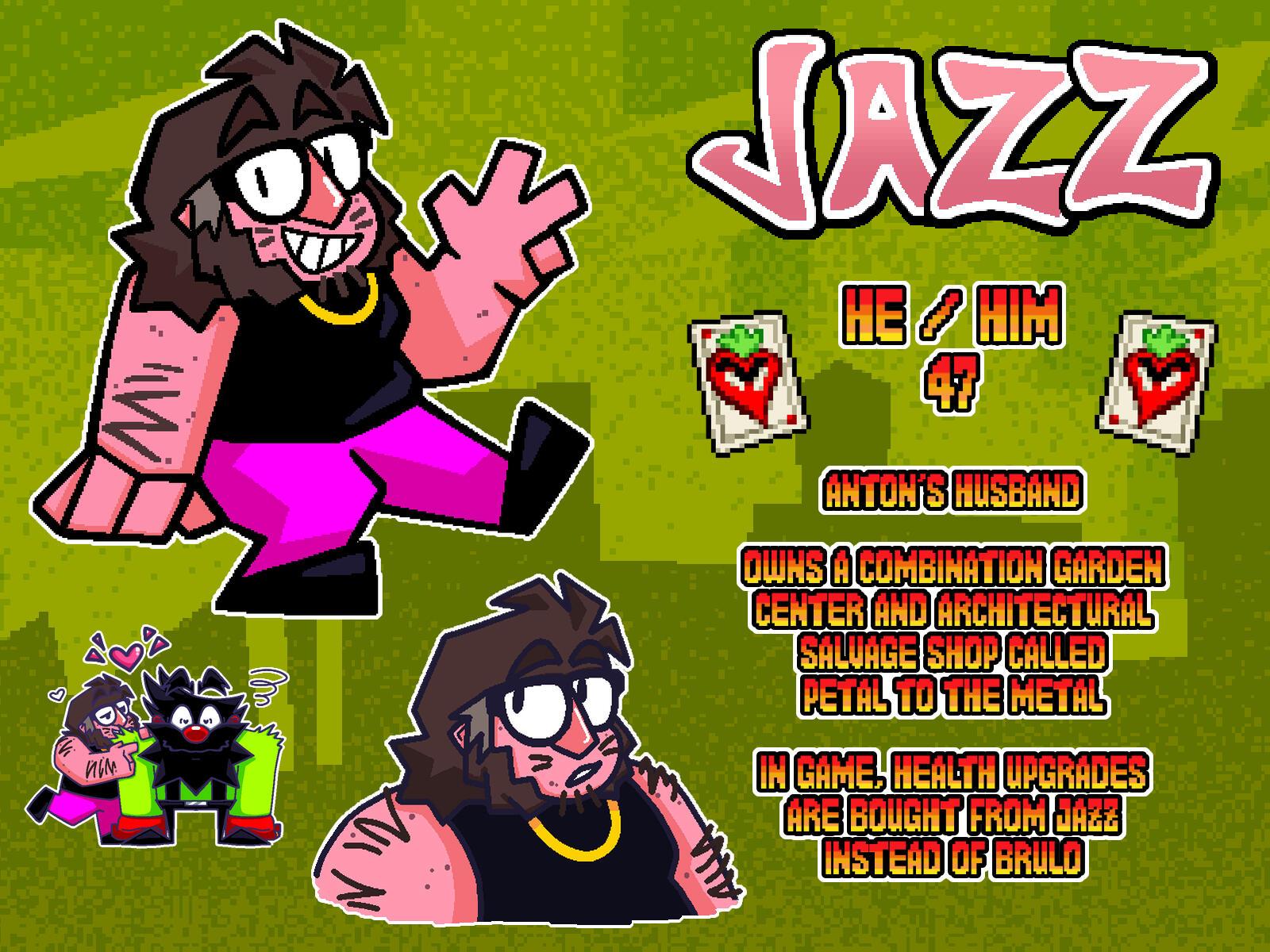 he/himAnton's husband!!! Has a tiny little shop a la "Hippo Hardware if it also sold plants." Raised around construction and demolition (father's pet projects) and always wants to hear about Anton's day at work or sneak onto demolition sites after hours. Thinks his husband is cool as hell but also is somewhat protective of him. Mostly chill, but not above causing his own type of chaos.tag - #jazz❤️🧱